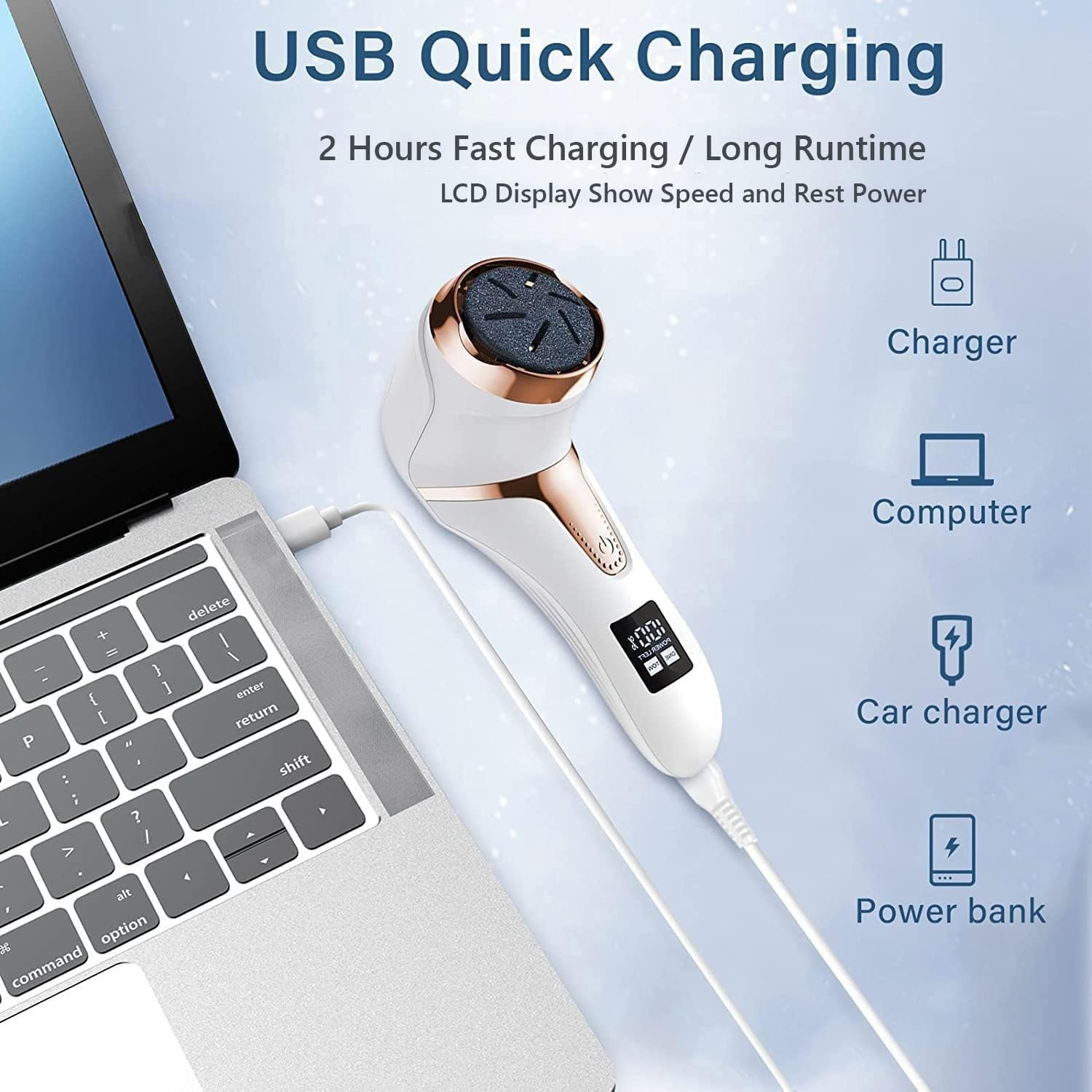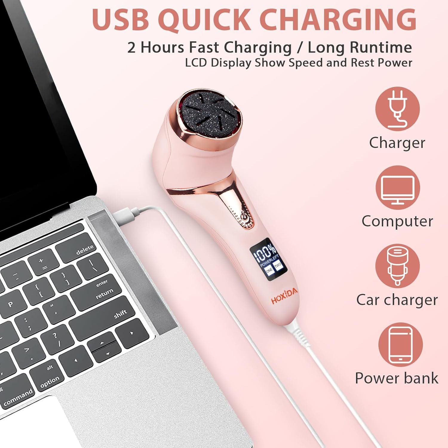 2. Recargable por USB: esta lima eléctrica de pie se puede cargar a través de cualquier puerto USB, y tiene un tiempo de funcionamiento 2 horas después de la carga completa.