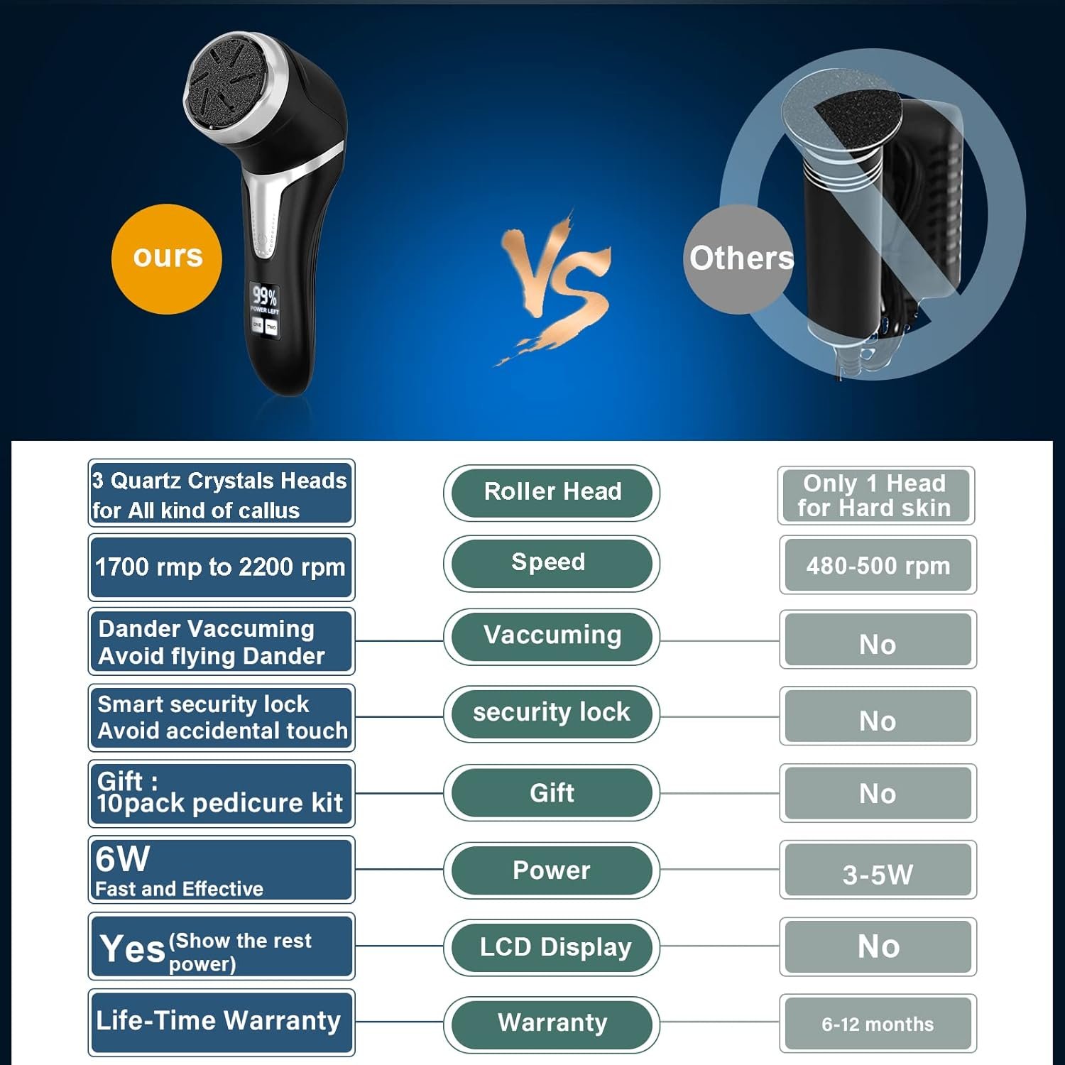 1. Con aspiradora: potente removedor de callos con aspiradora de caspa que absorbe rápidamente los restos de pies, limpia e higiénica, y chupa mientras se muele. Sin polvo, y los restos de pies no se dispersarán por todas partes, una función esencial para las personas que tienen limpieza.
