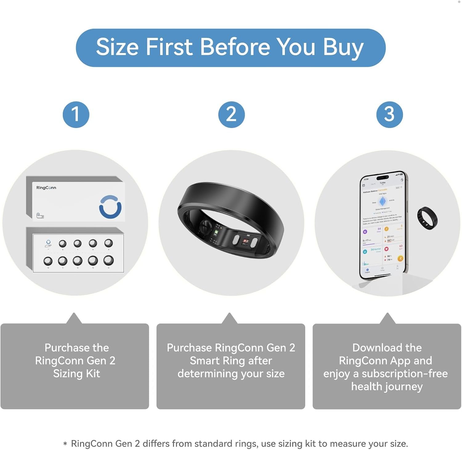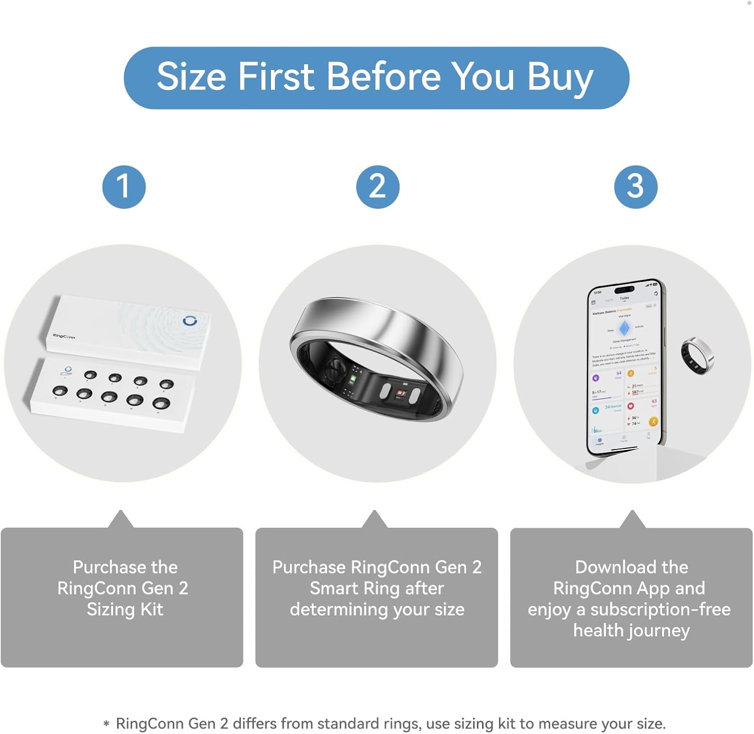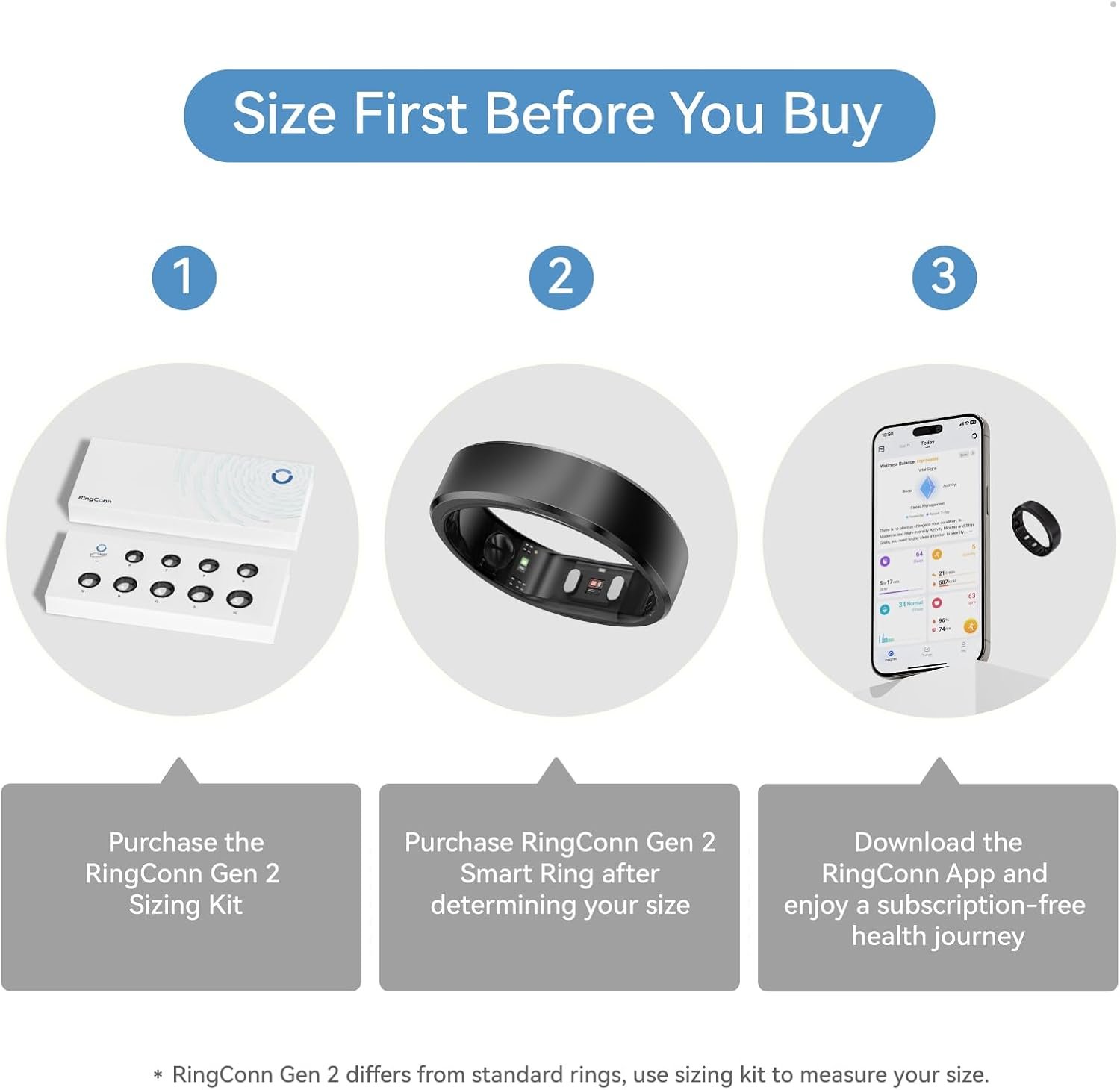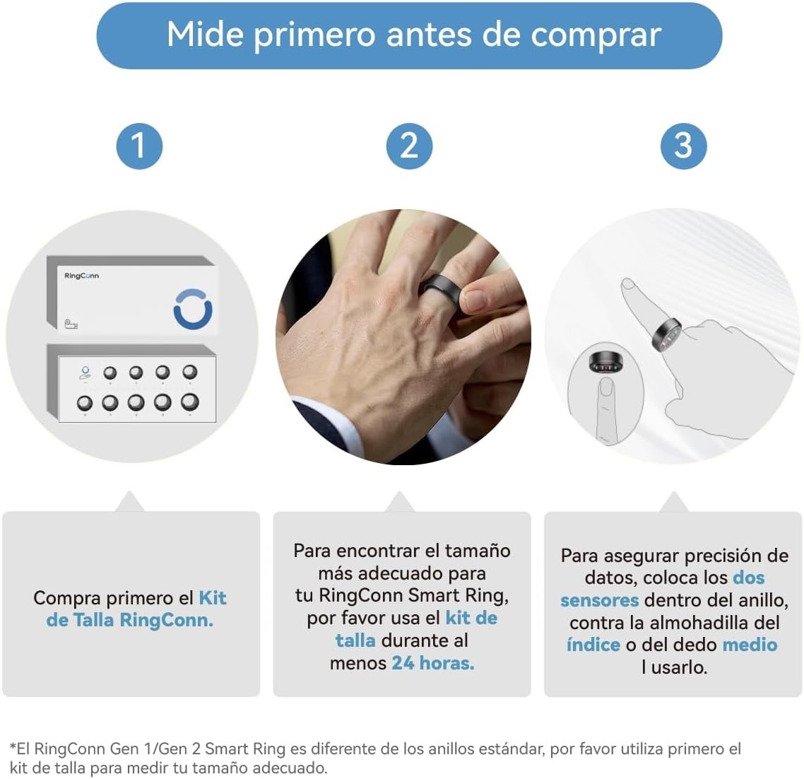 - Tamaño antes de comprar: el anillo inteligente RingConn Gen 2 utiliza estándares de tamaño únicos, diferentes de los anillos de salud de Estados Unidos y otros anillos de salud. El kit de tallas Gen 2 de RingConn te ayuda a encontrar el ajuste más cómodo y preciso para tu dedo, evitando las molestias de devoluciones e intercambios, asegurando que seleccionas el tamaño correcto antes de comprar