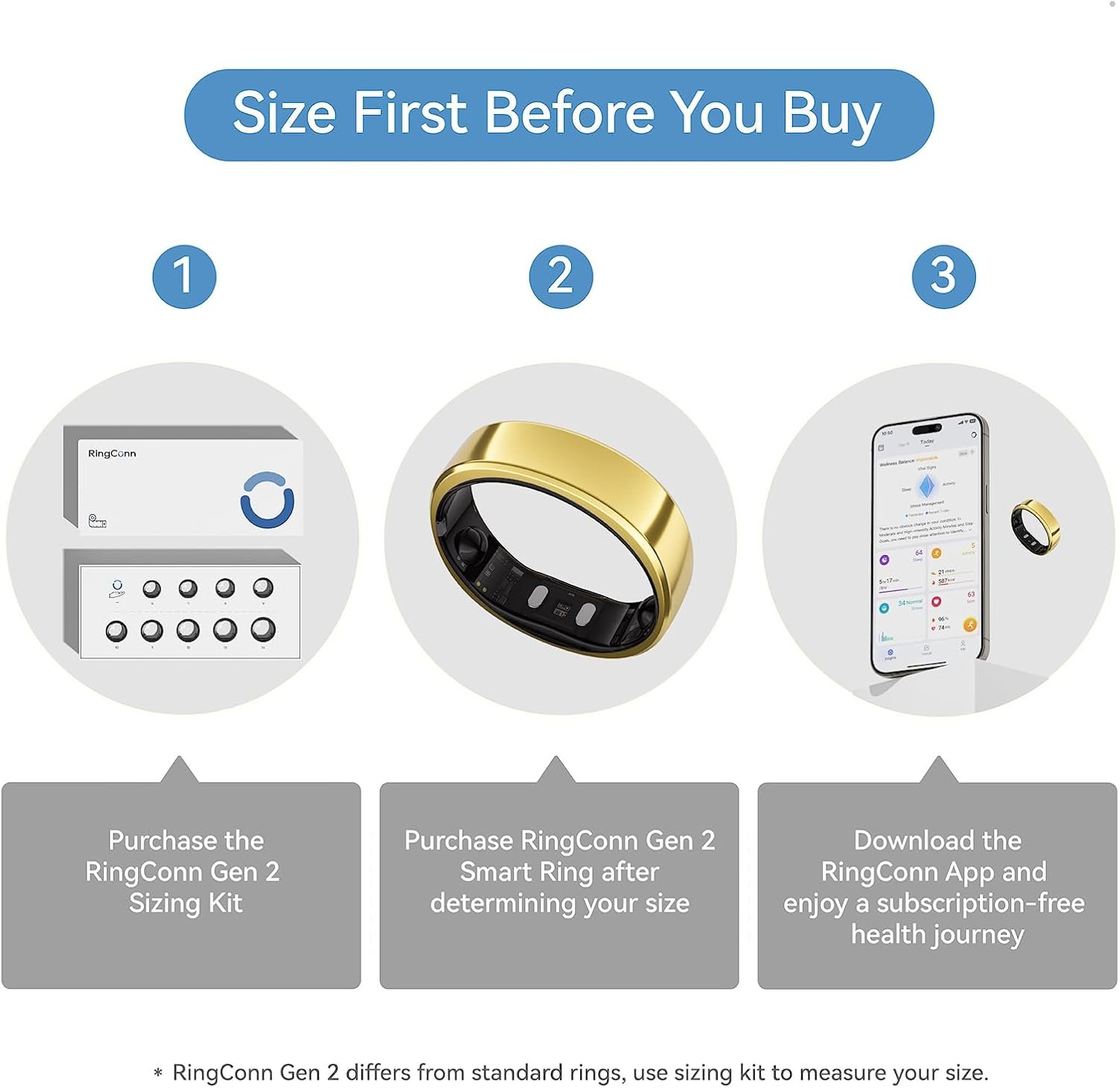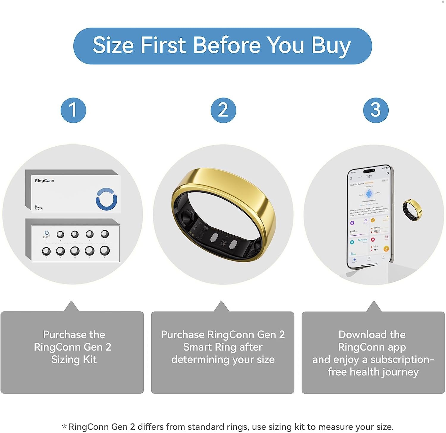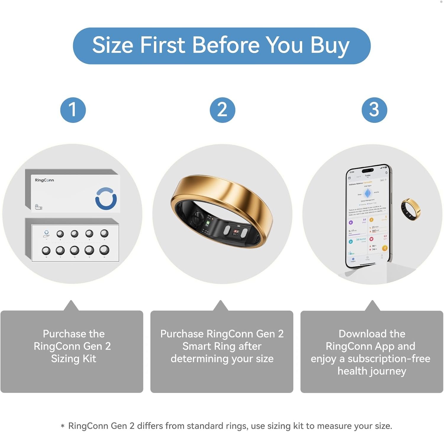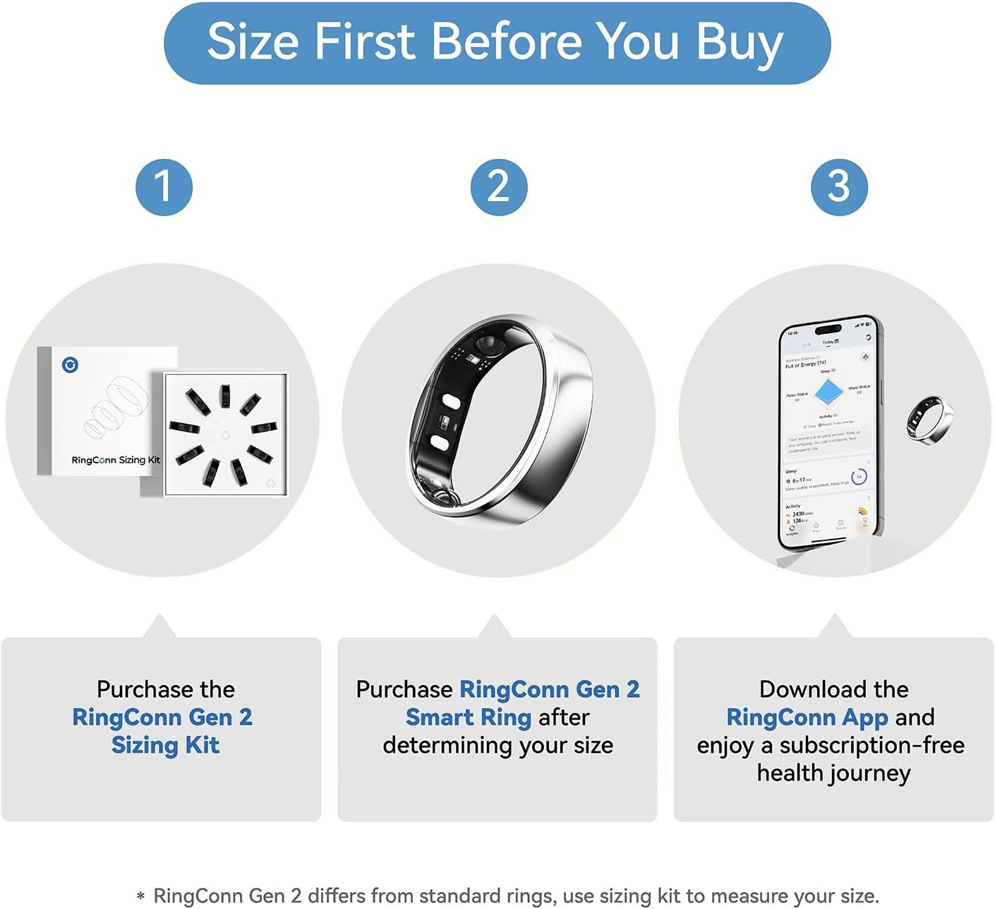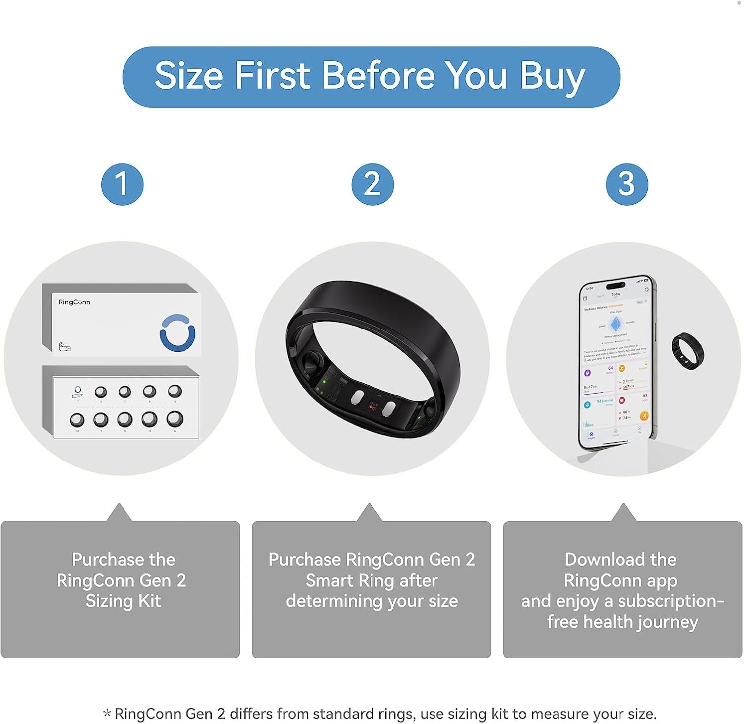 - Tamaño antes de comprar: el anillo inteligente RingConn Gen 2 utiliza estándares de tamaño únicos, diferentes de los anillos de salud de Estados Unidos y otros anillos de salud. El kit de tallas Gen 2 de RingConn te ayuda a encontrar el ajuste más cómodo y preciso para tu dedo, evitando las molestias de devoluciones e intercambios, asegurando que seleccionas el tamaño correcto antes de comprar