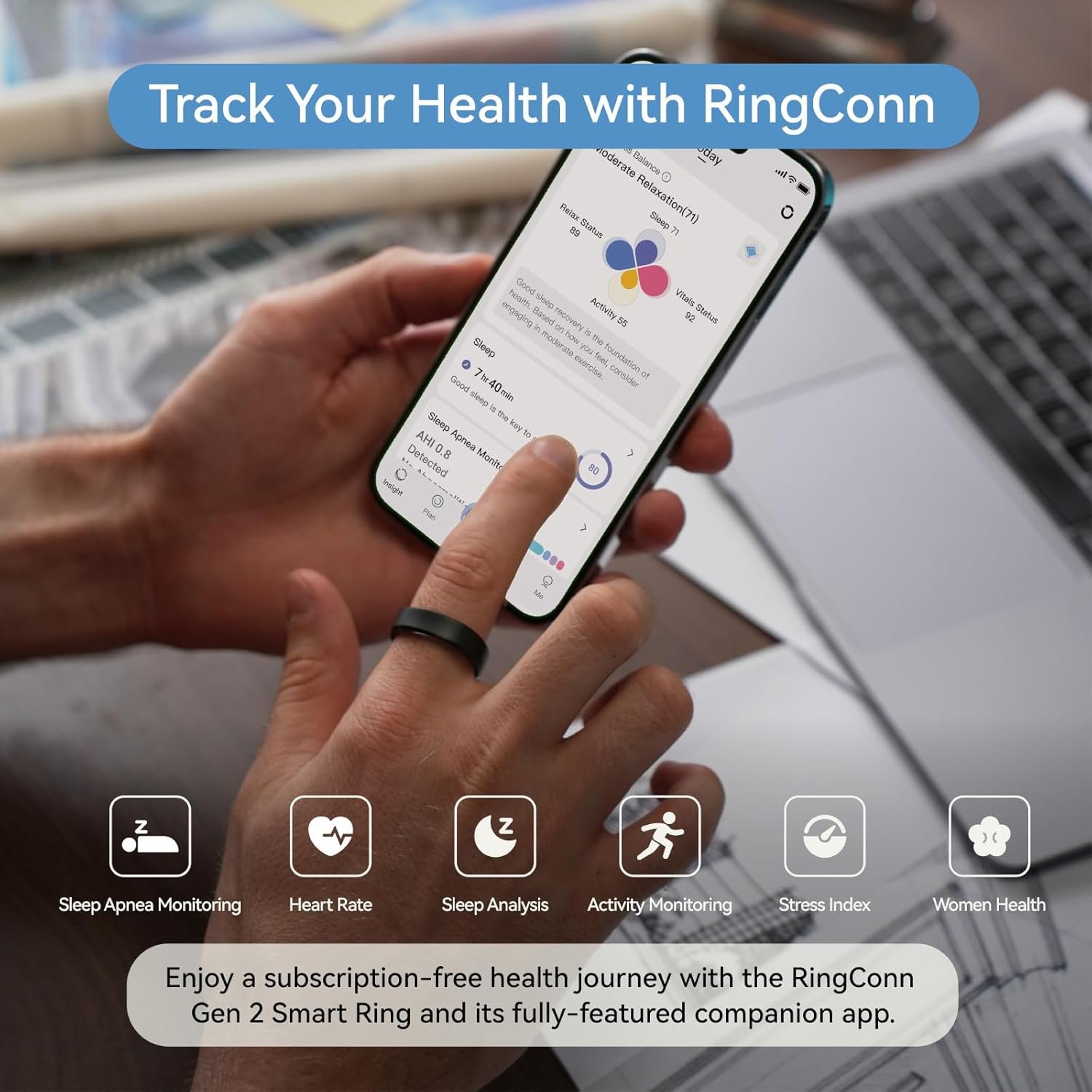- Monitoreo de la apnea del sueño: el anillo inteligente RingConn Gen 2 apoya la salud del sueño con tecnología avanzada. Desarrollado con universidades y hospitales líderes, este anillo impulsado por IA rastrea con precisión la apnea del sueño. A diferencia de los dispositivos tradicionales, es ligero y cómodo, ofrece monitoreo de varios días con datos AHI en tiempo real e información personalizada a través de una aplicación dedicada para una fácil gestión de la salud del sueño