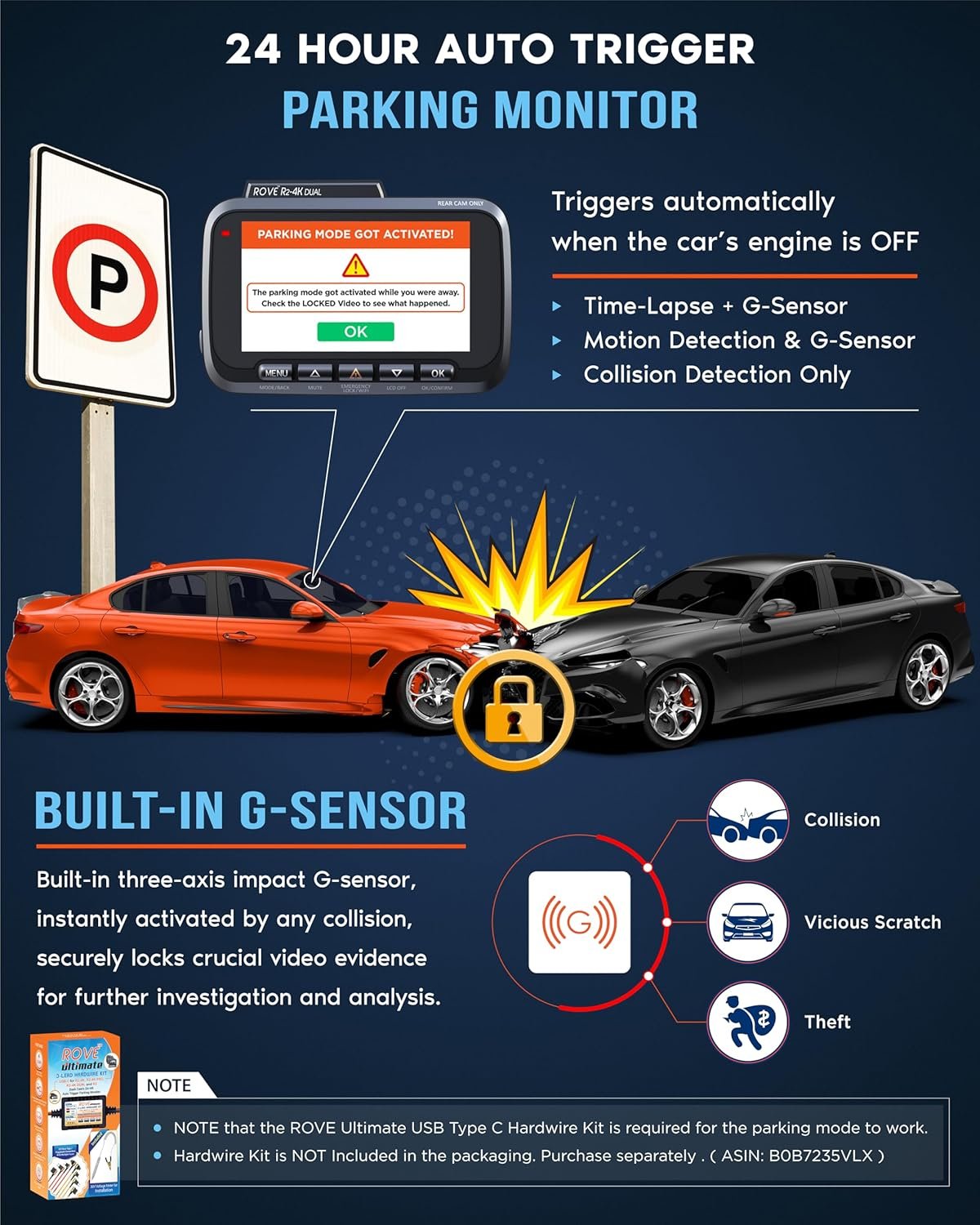- Nuestro modo de estacionamiento 24/7 de diseño personalizado – R2-4K DUAL ofrece tres opciones para su modo de estacionamiento 24 horas diseñado a medida con guía de voz. Video timelapse de 1fps, detección de movimiento y detección de colisiones. Se requiere un kit de cableado (compra por separado, ASIN: B0B7235VLX). Si ocurre un evento en el parque, la cámara grabará un video completo de 1 minuto, lo bloqueará de forma segura en una carpeta de eventos y le dará una alerta de voz la próxima vez que encienda su automóvil informándole que el evento ha ocurrido mientras estaba fuera.