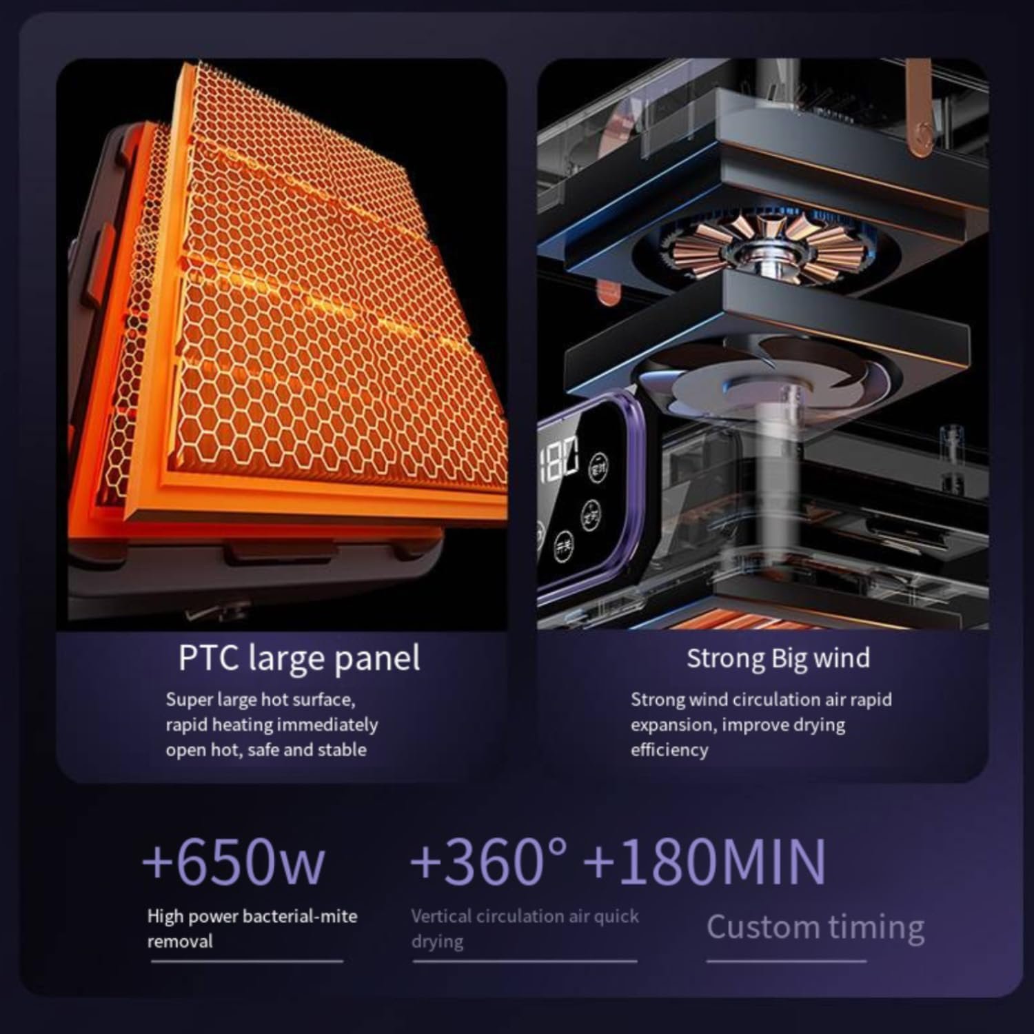 - Secado rápido y actualización suave: gran panel de calefacción PTC y ventilador turbo de seis cuchillas para un secado completo; tecnología de iones negativos UV+ de alta potencia de 650 W para refrescar la salud de la ropa.
