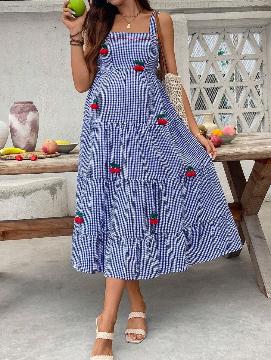 Vestido de embarazo estilo cuadros y cereza con cuello cuadrado y sin mangas, para verano