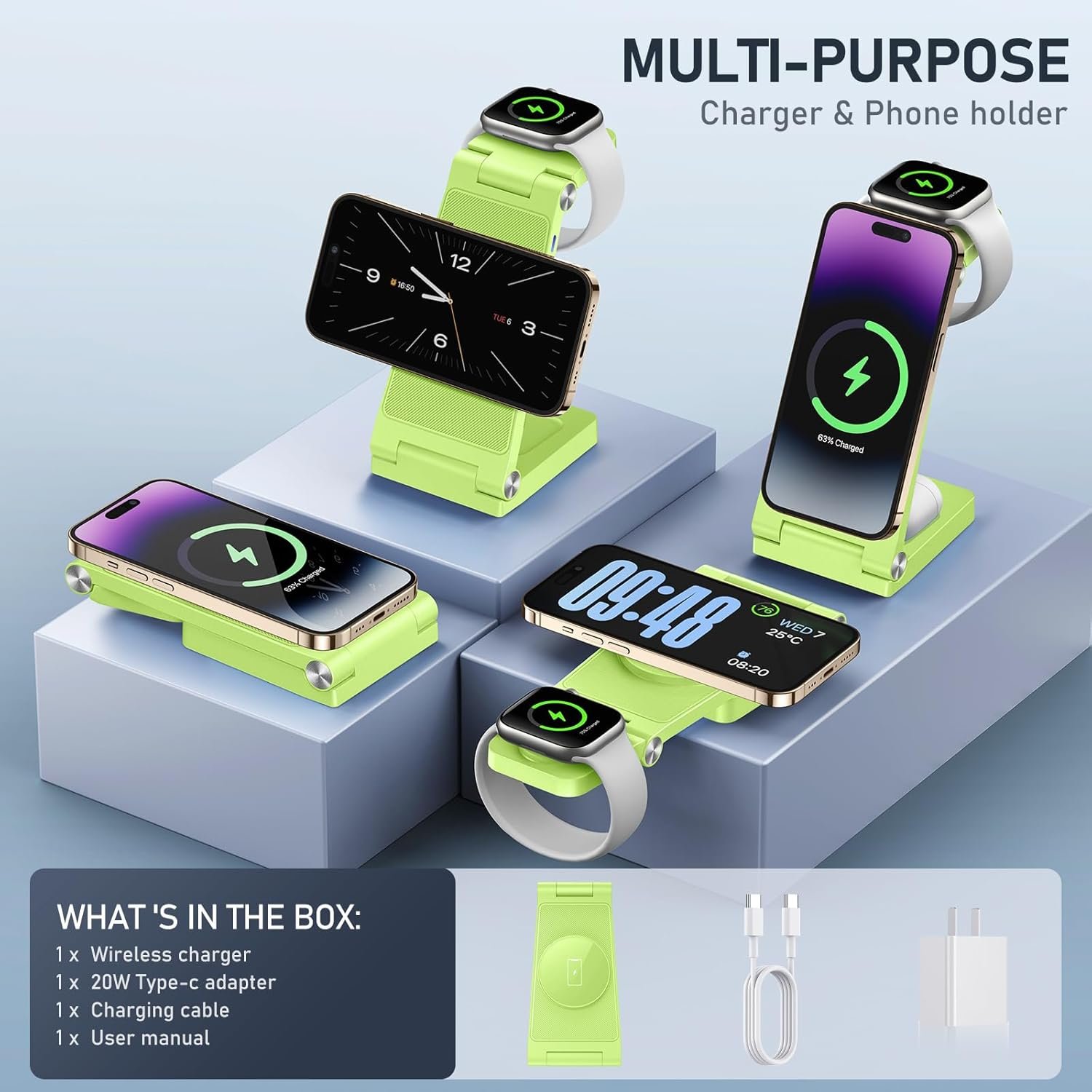 Diseñado para ser ligero y portátil, si estás de viaje o de negocios, trae este cargador tres en uno, se puede utilizar como un soporte para teléfono móvil cuando estás en un viaje largo. Carga varios dispositivos a la vez, sin necesidad de llevar más cables de carga y enchufes.