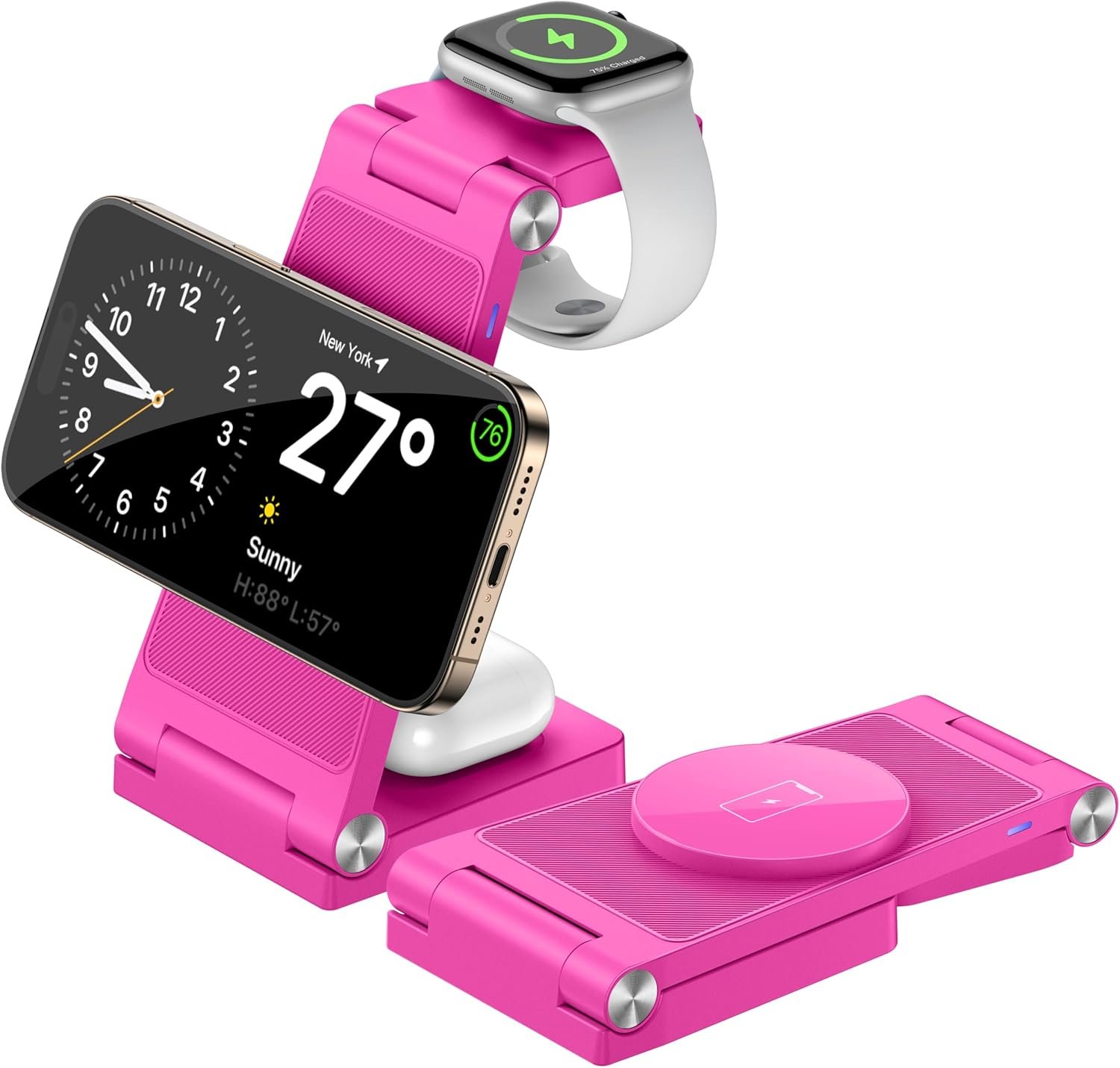 Diseñado con un simple cargador plegable, fácil de llevar, sin necesidad de llevar cables y enchufes adicionales cuando estás de viaje o de negocios. Solo 1 cable para los 3 dispositivos, di adiós al cable desordenado, haz que tu escritorio o mesita de noche esté ordenado y organizado.
