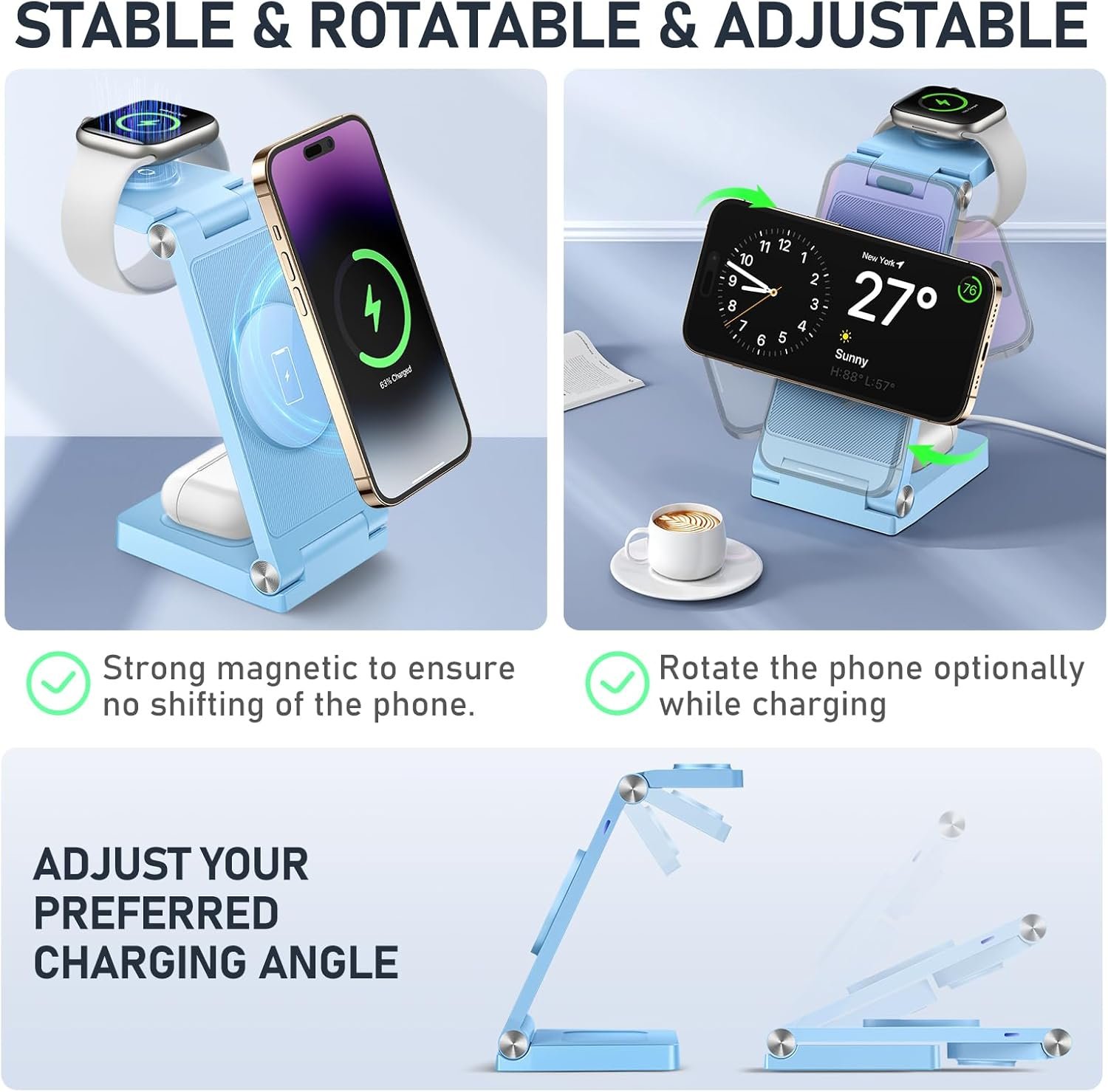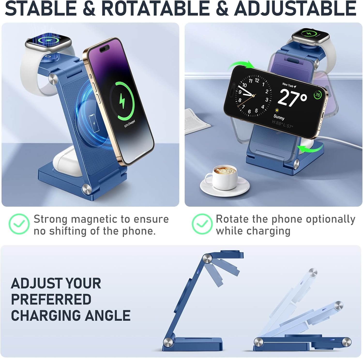 Aspecto elegante y menos necesidad de enchufes, carga muy cómodamente tres dispositivos sin ensuciar tu escritorio o tomacorrientes. Para colocar el teléfono horizontal o verticalmente cuando se carga, proporcionando un ángulo de visión cómodo, buen compañero en la oficina.