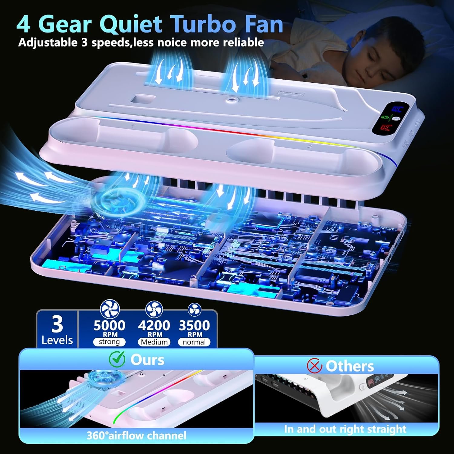 - Ventilador de refrigeración con 3 Turbo Slient: nuestra estación de refrigeración ps5 está equipada con un potente ventilador turbo con tres velocidades de ventilador de nivel ajustable, proporciona una refrigeración eficiente y de bajo ruido para reducir altamente la temperatura de tu consola