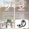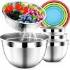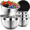 - Material duradero y fácil de limpiar: cada cuenco para mezclar está hecho de acero inoxidable de alta calidad, diseñado para resistir abolladuras y óxido, pero sigue siendo ligero y fácil de manejar. El interior espejado hace que la limpieza sea muy fácil. El tazón y el colador también son aptos para lavavajillas. Pero la tapa no es apta para lavavajillas. Las tapas son adecuadas para lavar a mano, ya que el calor del lavavajillas puede deformarlas.