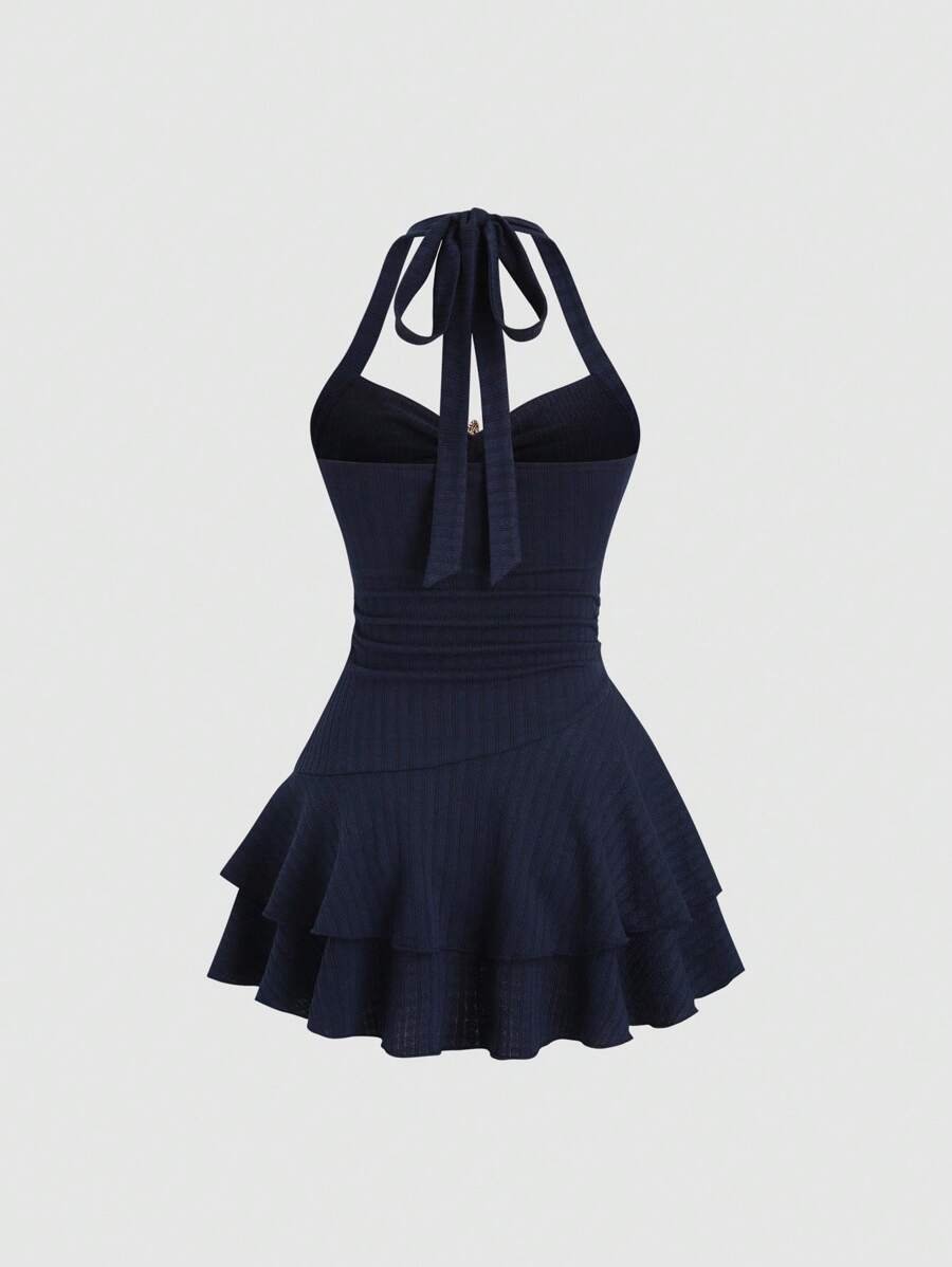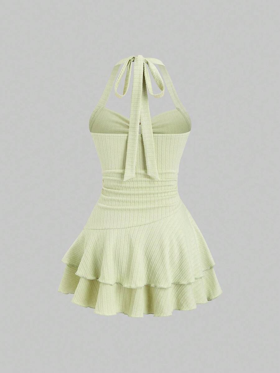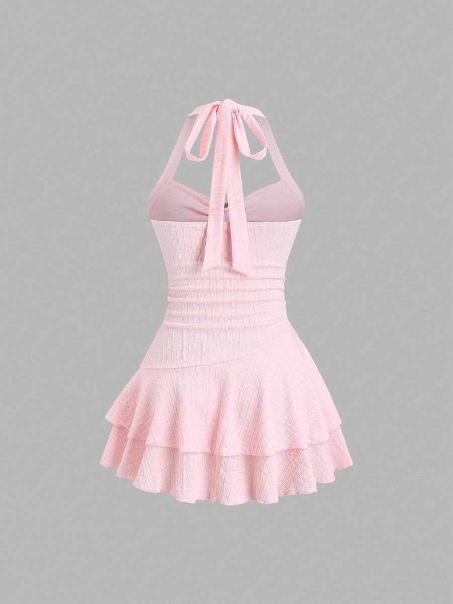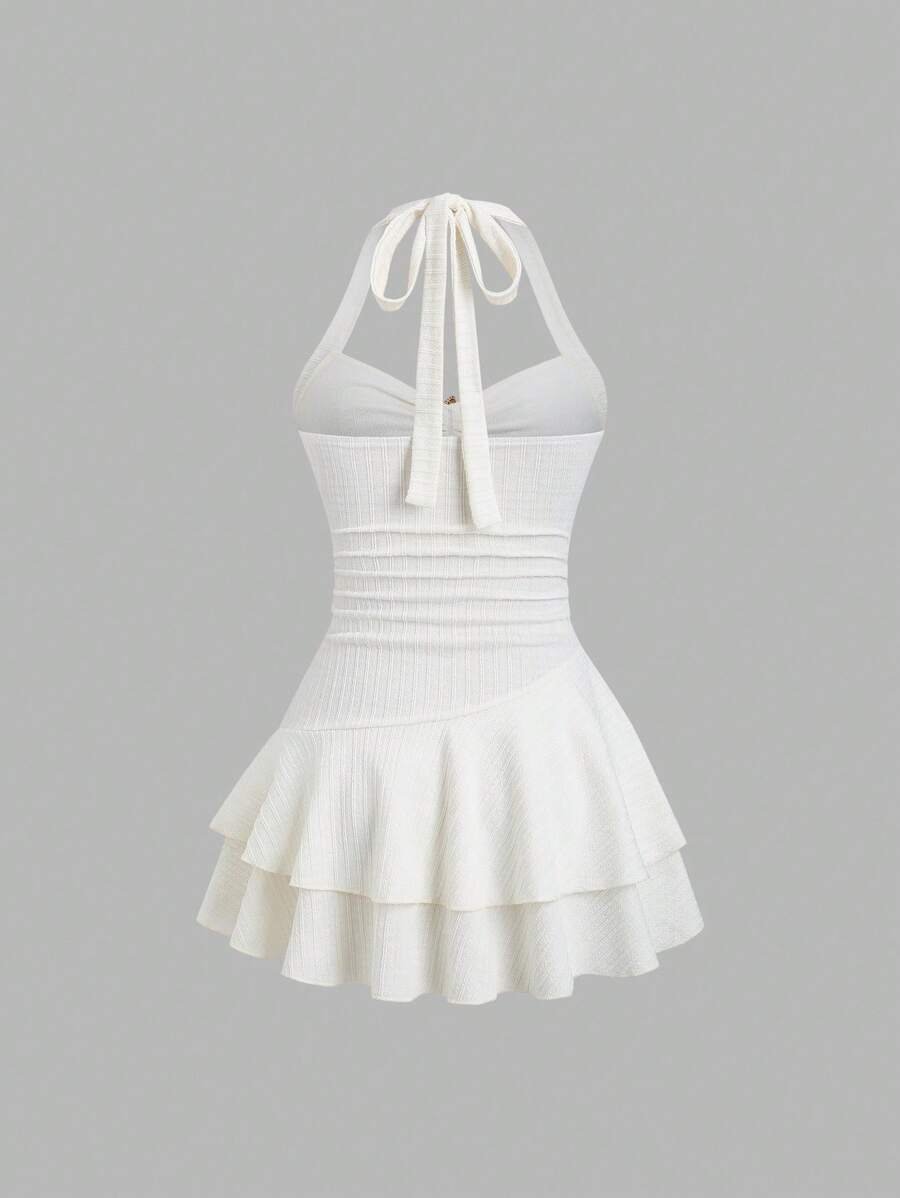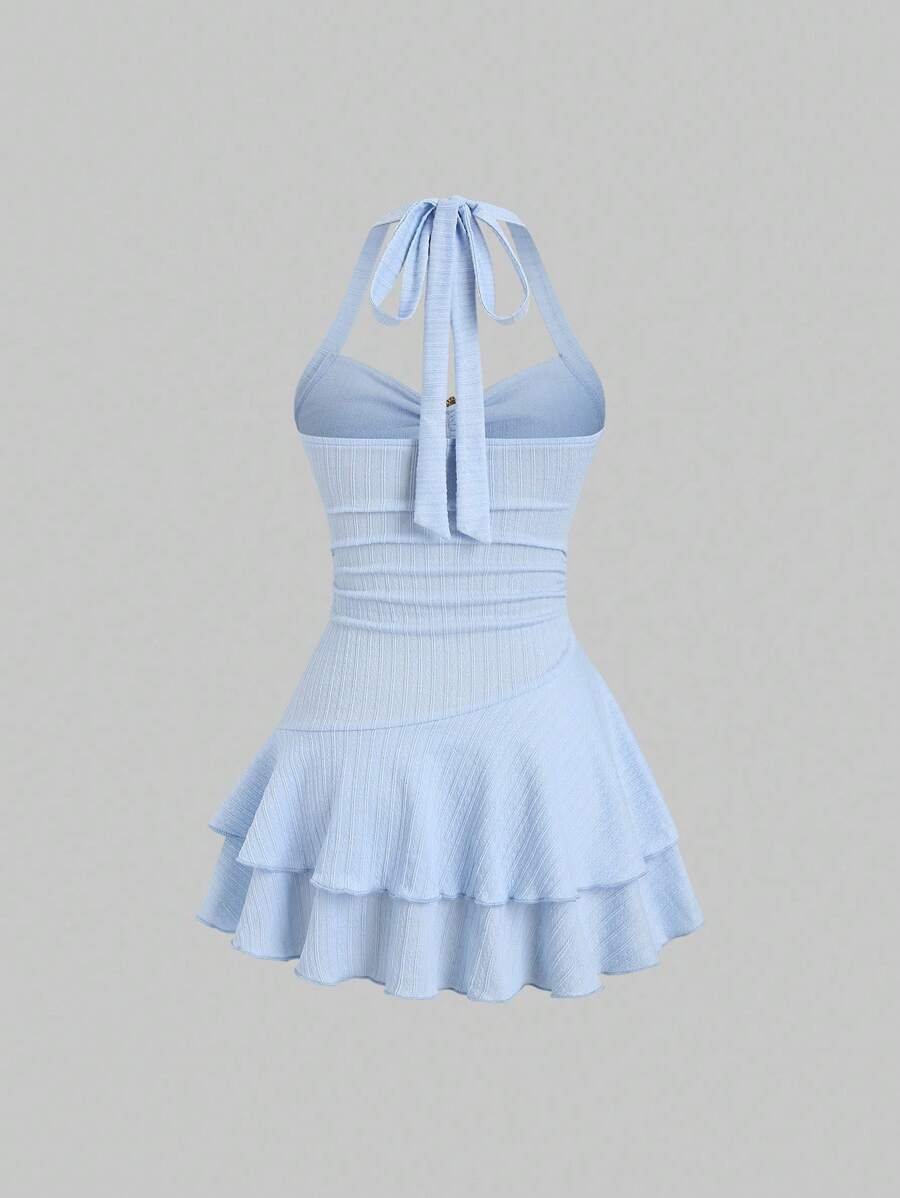 Sweetra Nuevo vestido mini elegante para mujer apropiado para la playa y vacaciones de verano, con tela con textura, cuello halter, lazo delantero, busto fruncido, decoración metálica, falda con volantes en capas y dobladillo juguetón