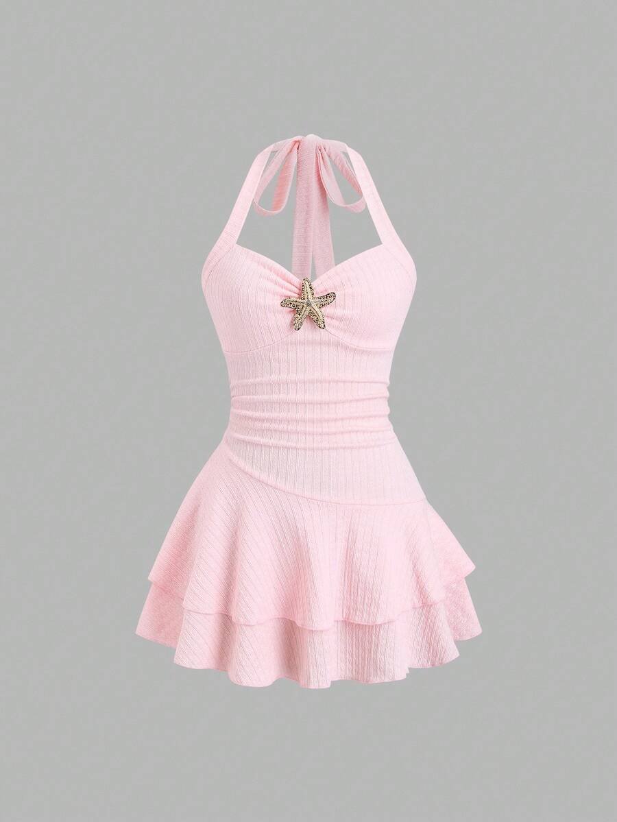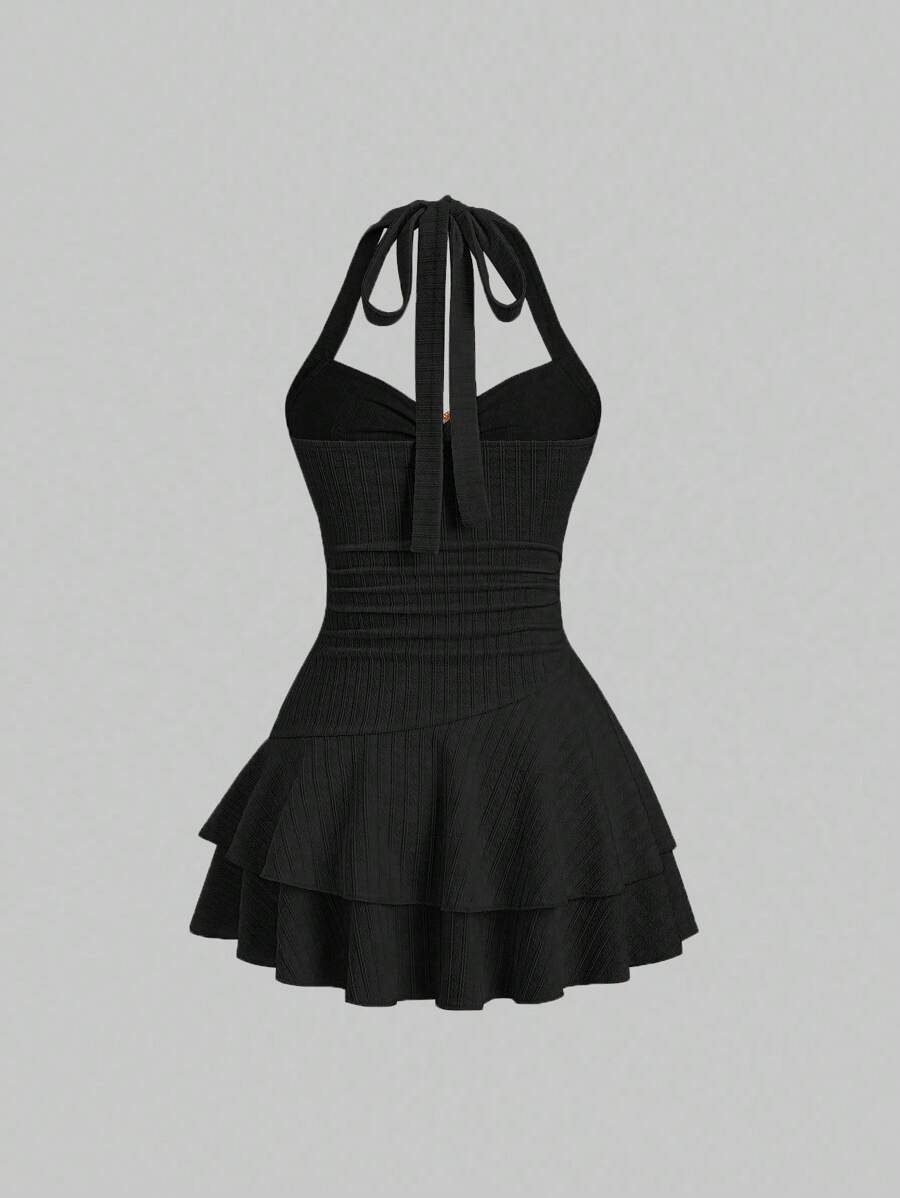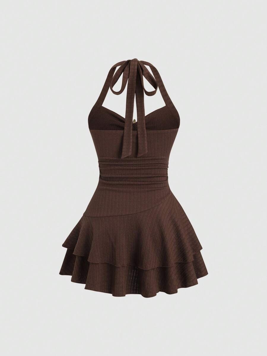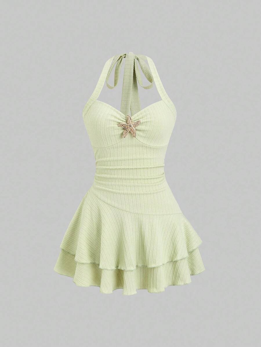 Sweetra Nuevo vestido mini elegante para mujer apropiado para la playa y vacaciones de verano, con tela con textura, cuello halter, lazo delantero, busto fruncido, decoración metálica, falda con volantes en capas y dobladillo juguetón