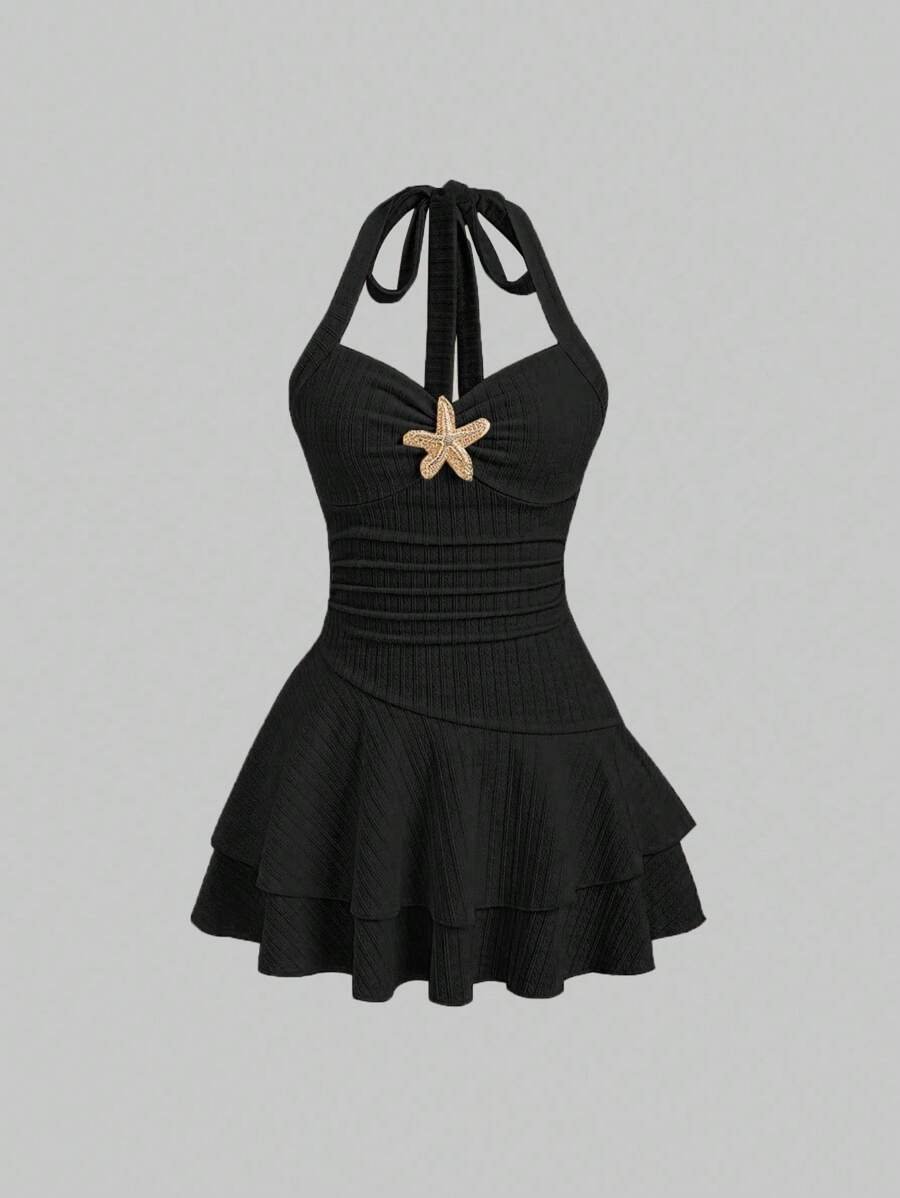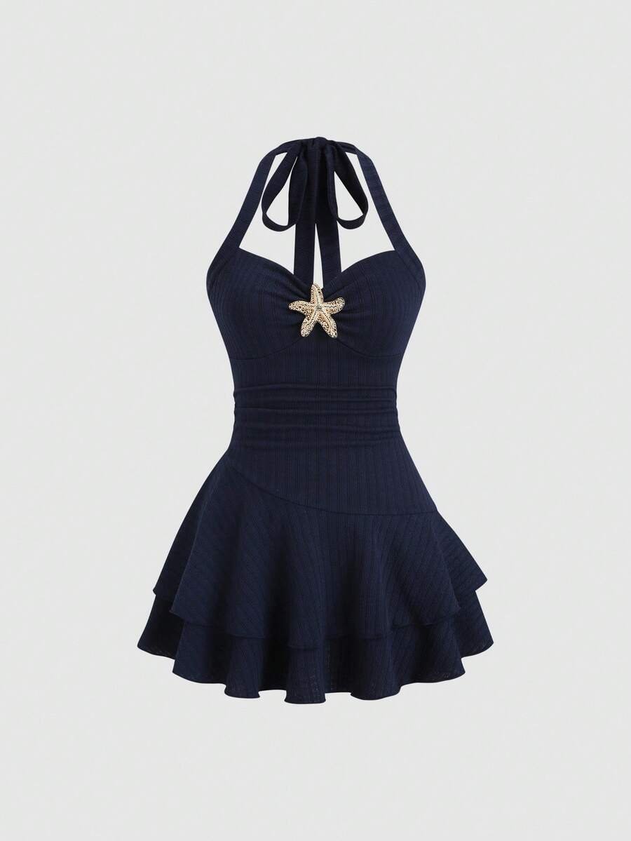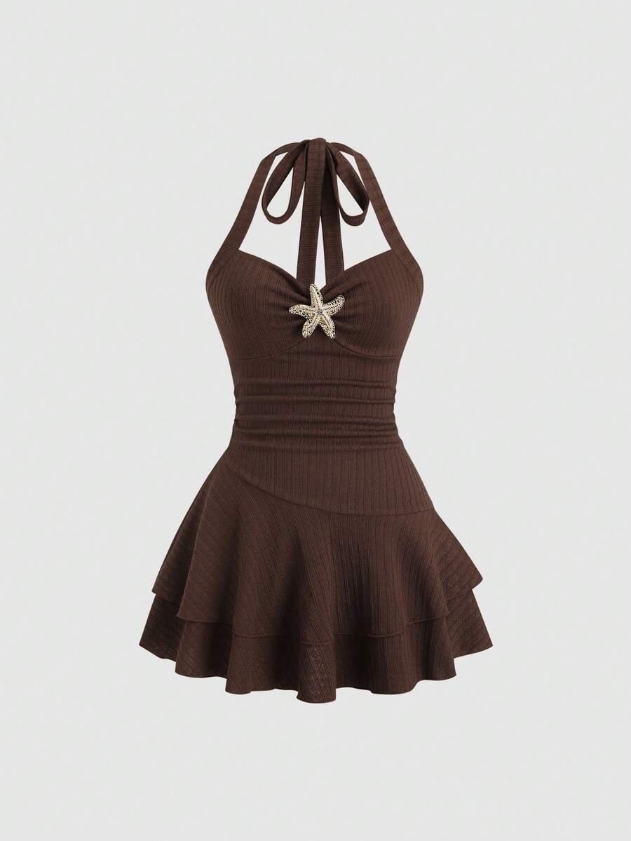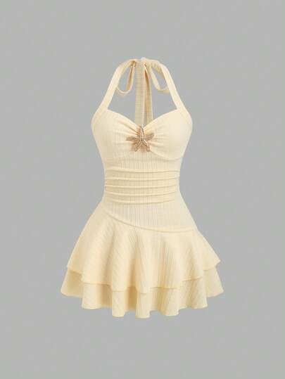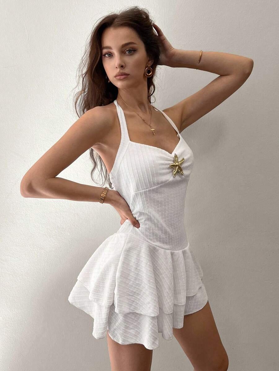 Sweetra Nuevo vestido mini elegante para mujer apropiado para la playa y vacaciones de verano, con tela con textura, cuello halter, lazo delantero, busto fruncido, decoración metálica, falda con volantes en capas y dobladillo juguetón