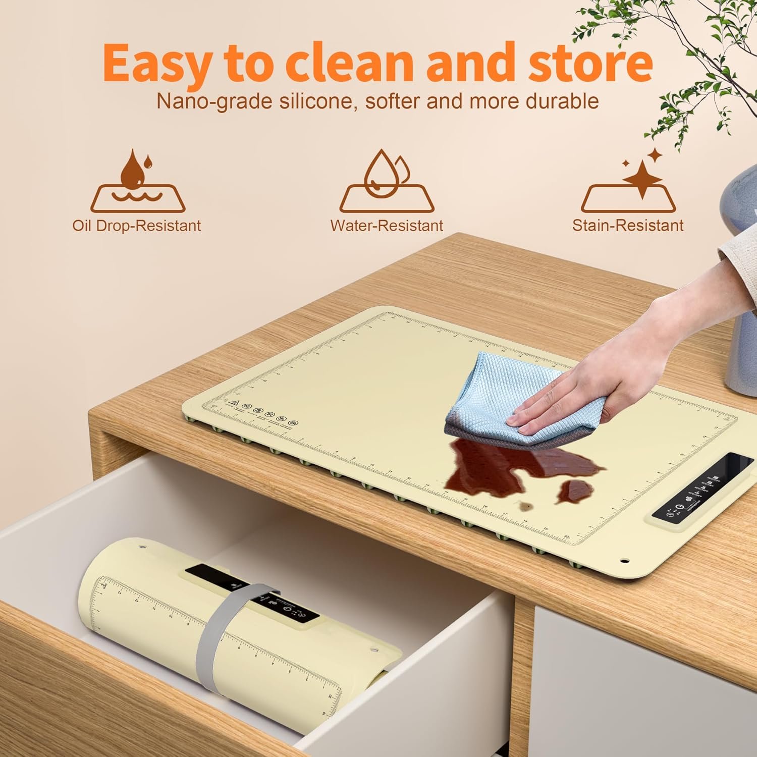 - Nano material de grado alimenticio: hecho de silicona de grado alimenticio, este material suave y duradero es capaz de soportar todo el desgaste del uso diario, y también garantiza la seguridad en contacto con los alimentos. La superficie de la bandeja de calentamiento es impermeable, por lo que si derramas accidentalmente sopa o residuos de alimentos, puedes limpiarla fácilmente para una apariencia más hermosa e higiénica.