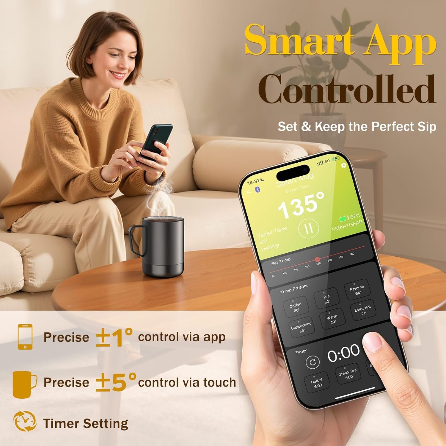 - Tecnología de taza inteligente: disfruta de la temperatura perfecta de tu bebida con una batería de larga duración. Los indicadores LED muestran la duración de la batería y la temperatura en tiempo real. El juego también incluye una tapa resistente a derrames y cable de carga, junto con una cuchara para mayor comodidad.