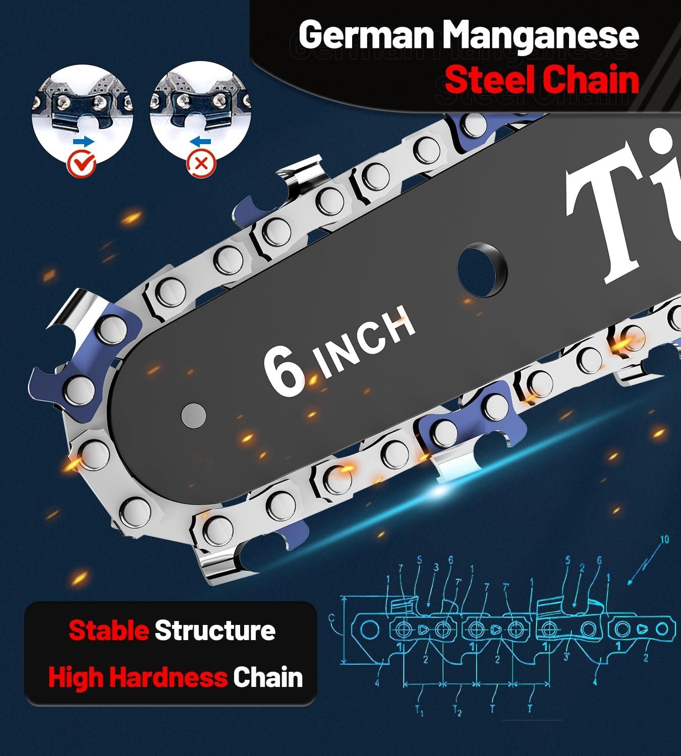 • Diseños de seguridad: 1. El bloqueo de seguridad evita la activación accidental (el bloqueo de seguridad y el botón de inicio deben presionarse simultáneamente para que la motosierra comience); 2. deflectores de seguridad para evitar que la madera salpique; 3. Equipado con un mango de textura antideslizante, lo que te hace agarrar la mini motosierra firmemente; la seguridad viene, no dudes en usarla