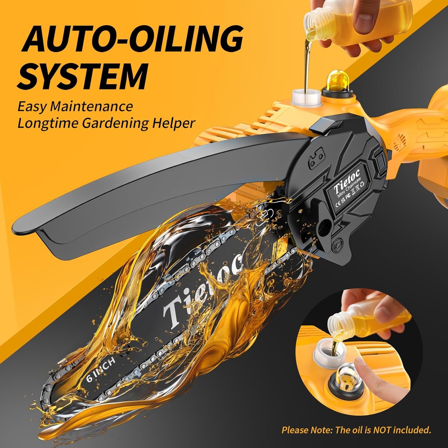 • SISTEMA DE ACEITE AUTOMÁTICO: Esta mini motosierra inalámbrica está equipada con un sistema de lubricación de cadena automática. Simplemente vierte aceite (el aceite general del motor está bien) en el tanque, luego puedes lubricar libremente la cadena presionando, reduciendo el desgaste para un corte más suave, más cortes y menos uso de energía. Un relleno de aceite se puede utilizar durante todo el día, no más llevar una botella pesada de aceite lubricante