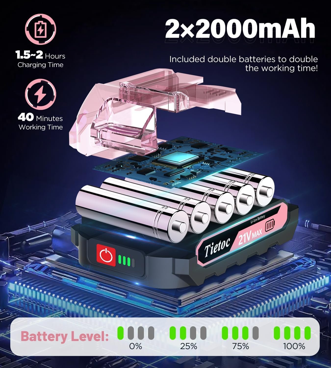 • 2 baterías de gran capacidad: equipada con 2 baterías extraíbles y recargables de 2000 mAh (fácil de instalar, simplemente se desliza), la mini motosierra inalámbrica terminará todo tu corte, incluso en el campo. Indicador de nivel de carga de la batería (¡Algunas otras motosierras pequeñas no tienen eso!) te hace saber cuándo es el momento de cargarlo, y la protección contra sobrecarga y temperatura proporcionan a las baterías una vida útil mucho más larga.