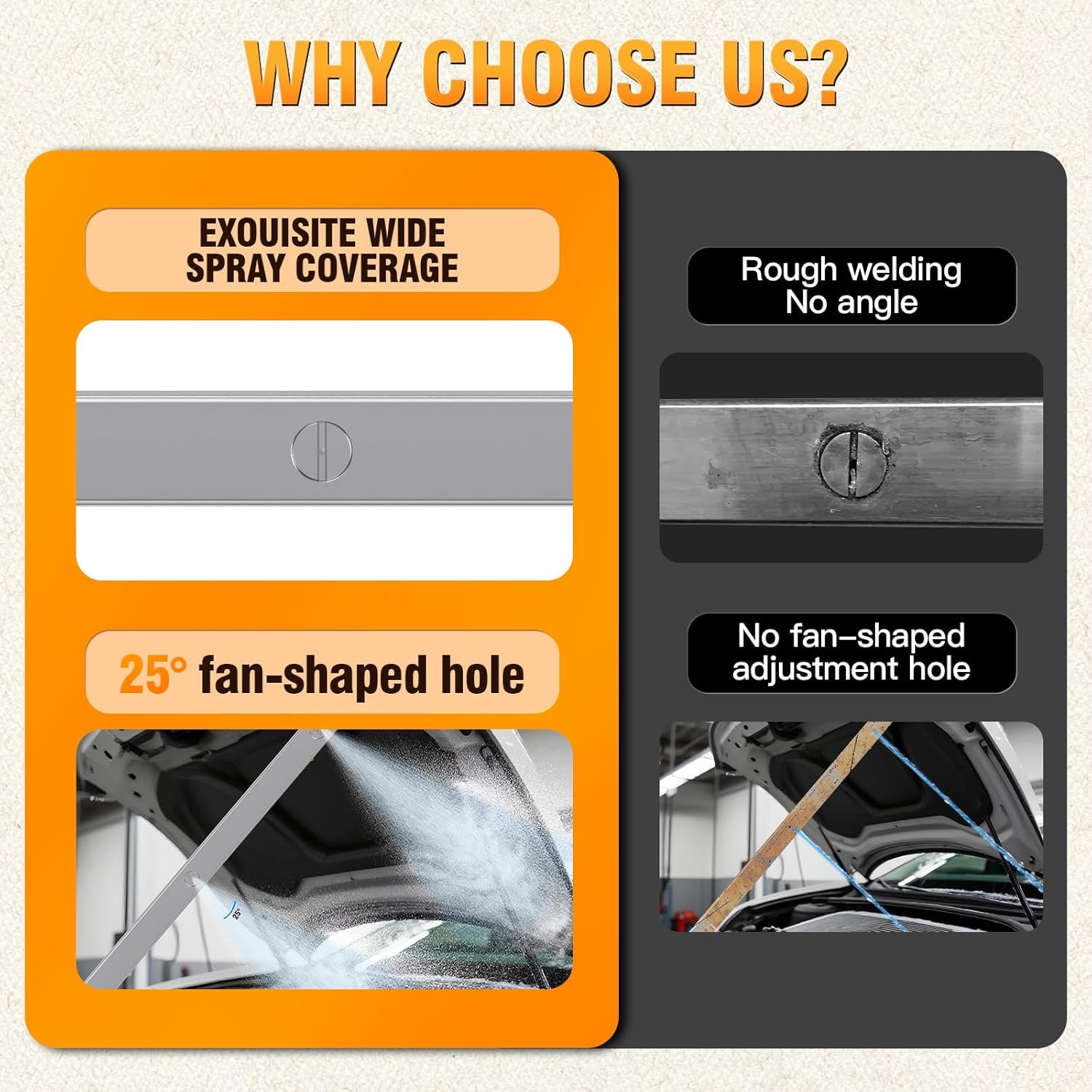 - Boquillas de pulverización de ventilador de 25° integradas: equipado con 6 boquillas empotradas en forma de ventilador que ofrecen un amplio patrón de pulverización de 25°. Garantiza una distribución uniforme del agua y un potente enjuague, perfecto para eliminar el barro, los insectos y los desechos de los radiadores, condensadores, trenes de rodaje y bahías apretadas del motor.