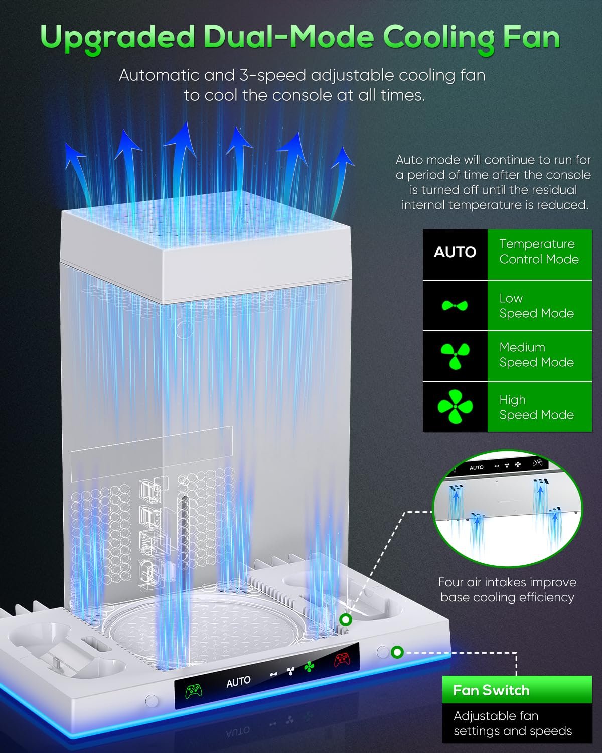 Only the top has a fan, but the bottom has four ventilation openings to help the console dissipate heat better