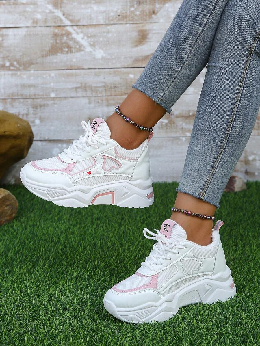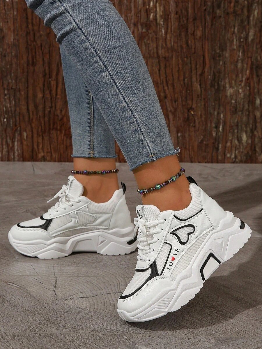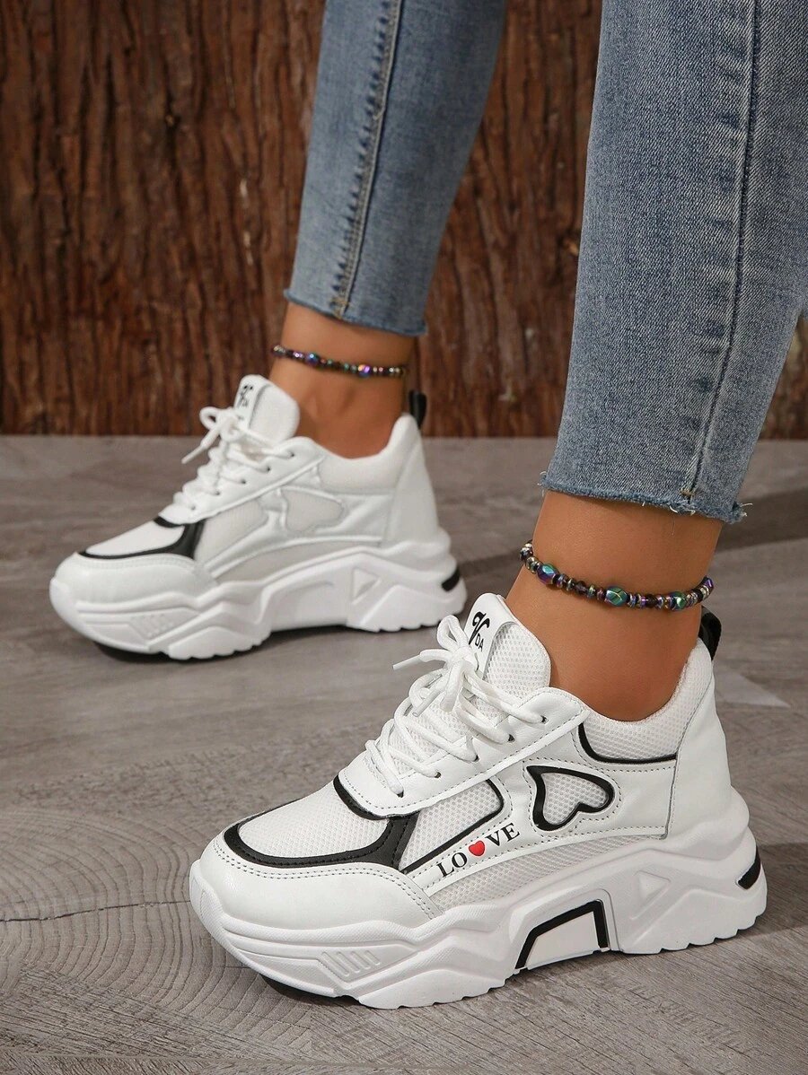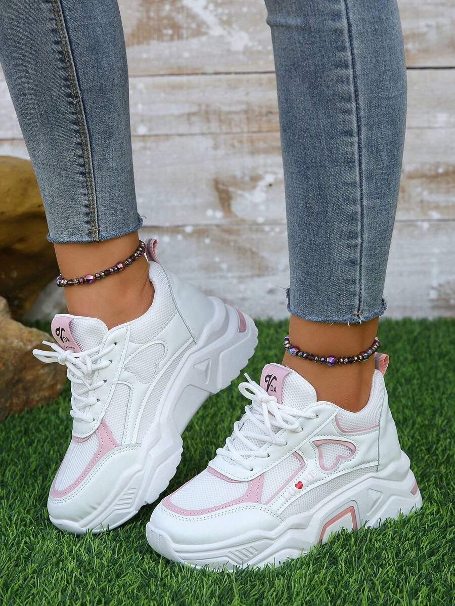 Zapatillas deportivas de cuña con panel de malla de dos tonos y gráfico de letras para mujer, para otoño/invierno. Zapatos deportivos con cordones gruesos para exteriores
